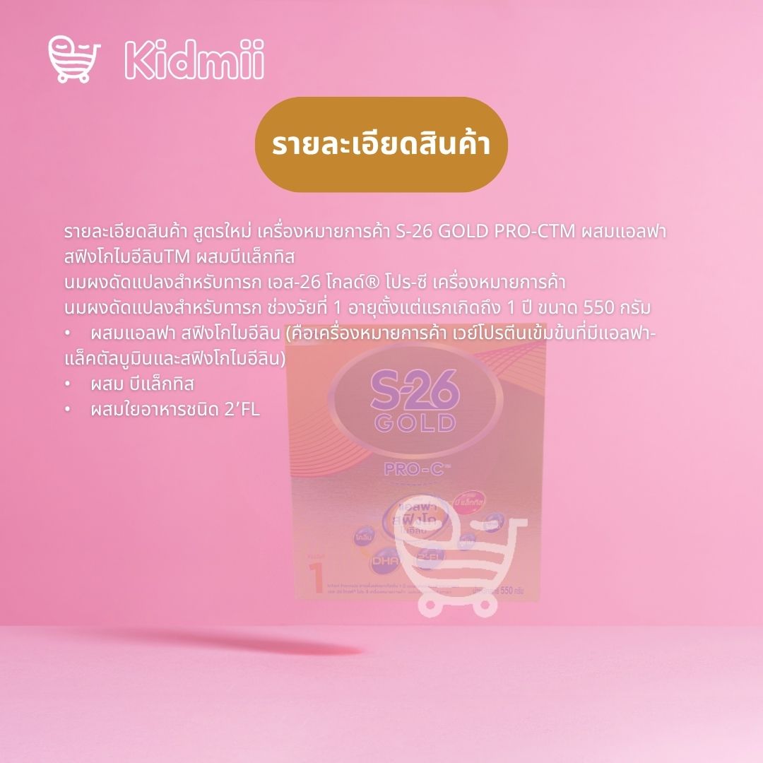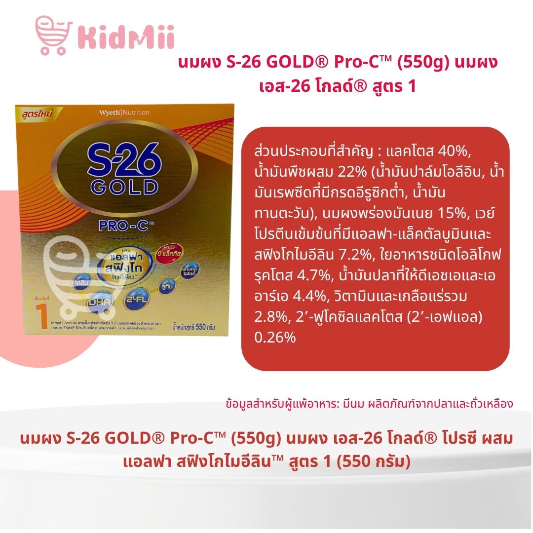Last Updatedส่วนประกอบที่สำคัญ : แลคโตส 40%, น้ำมันพืชผสม 22% (น้ำมันปาล์มโอลีอิน, น้ำมันเรพซีดที่มีกรดอีรูซิกต่ำ, น้ำมันทานตะวัน), นมผงพร่องมันเนย 15%, เวย์โปรตีนเข้มข้นที่มีแอลฟา-แล็คตัลบูมินและสฟิงโกไมอีลิน 7.2%, ใยอาหารชนิดโอลิโกฟรุคโตส 4.7%, น้ำมันปลาที่ให้ดีเอชเอและเออาร์เอ 4.4%, วิตามินและเกลือแร่รวม 2.8%, 2’-ฟูโคซิลแลคโตส (2’-เอฟแอล) 0.26%, บิฟิโดแบคทีเรียม แล็กทิส 0.125%, นิวคลีโอไทด์รวม 0.06%, แอล-ไทโรซีน 0.033%, แอล-ทริปโตเฟน 0.022%, ทอรีน 0.016%, แอล-คาร์นิทีน 0.008%, อิมัลซิไฟเออร์ (INS322(i)), สารป้องกันการเกิดออกซิเดชั่น (INS304, INS307b), สารควบคุมความเป็นกรด (INS330, INS331(iii)), สารช่วยพา (มอลโทเดกซ์ทริน)