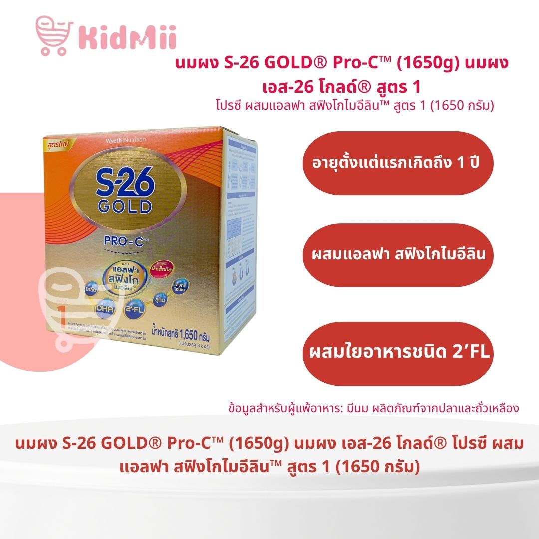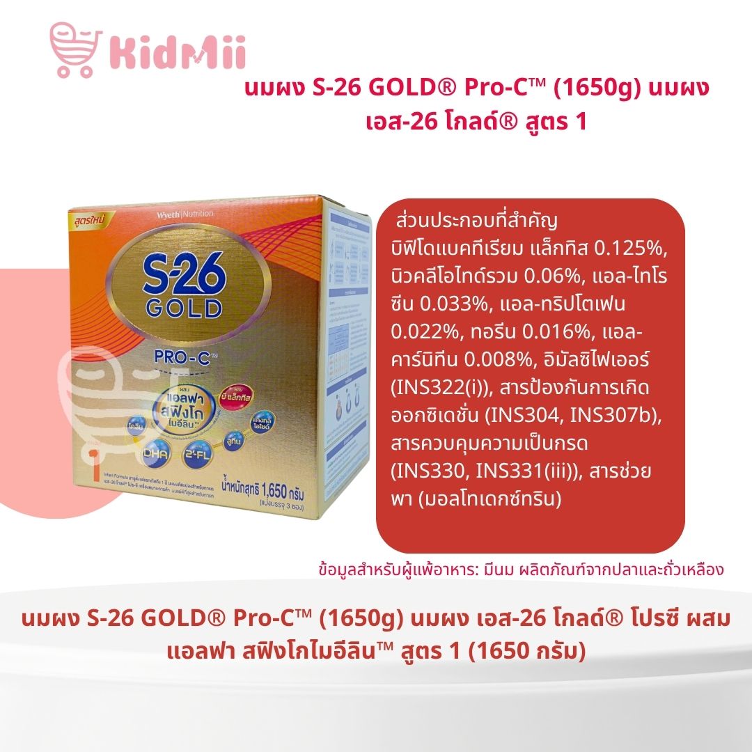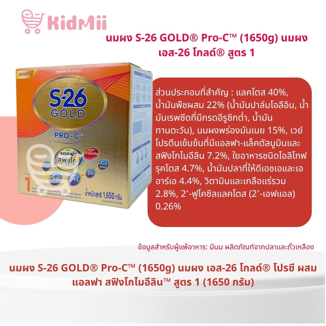 Last Updatedส่วนประกอบที่สำคัญ : แลคโตส 40%, น้ำมันพืชผสม 22% (น้ำมันปาล์มโอลีอิน, น้ำมันเรพซีดที่มีกรดอีรูซิกต่ำ, น้ำมันทานตะวัน), นมผงพร่องมันเนย 15%, เวย์โปรตีนเข้มข้นที่มีแอลฟา-แล็คตัลบูมินและสฟิงโกไมอีลิน 7.2%, ใยอาหารชนิดโอลิโกฟรุคโตส 4.7%, น้ำมันปลาที่ให้ดีเอชเอและเออาร์เอ 4.4%, วิตามินและเกลือแร่รวม 2.8%, 2’-ฟูโคซิลแลคโตส (2’-เอฟแอล) 0.26%, บิฟิโดแบคทีเรียม แล็กทิส 0.125%, นิวคลีโอไทด์รวม 0.06%, แอล-ไทโรซีน 0.033%, แอล-ทริปโตเฟน 0.022%, ทอรีน 0.016%, แอล-คาร์นิทีน 0.008%, อิมัลซิไฟเออร์ (INS322(i)), สารป้องกันการเกิดออกซิเดชั่น (INS304, INS307b), สารควบคุมความเป็นกรด (INS330, INS331(iii)), สารช่วยพา (มอลโทเดกซ์ทริน)