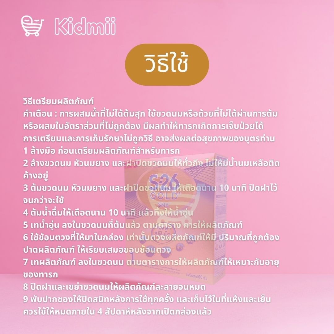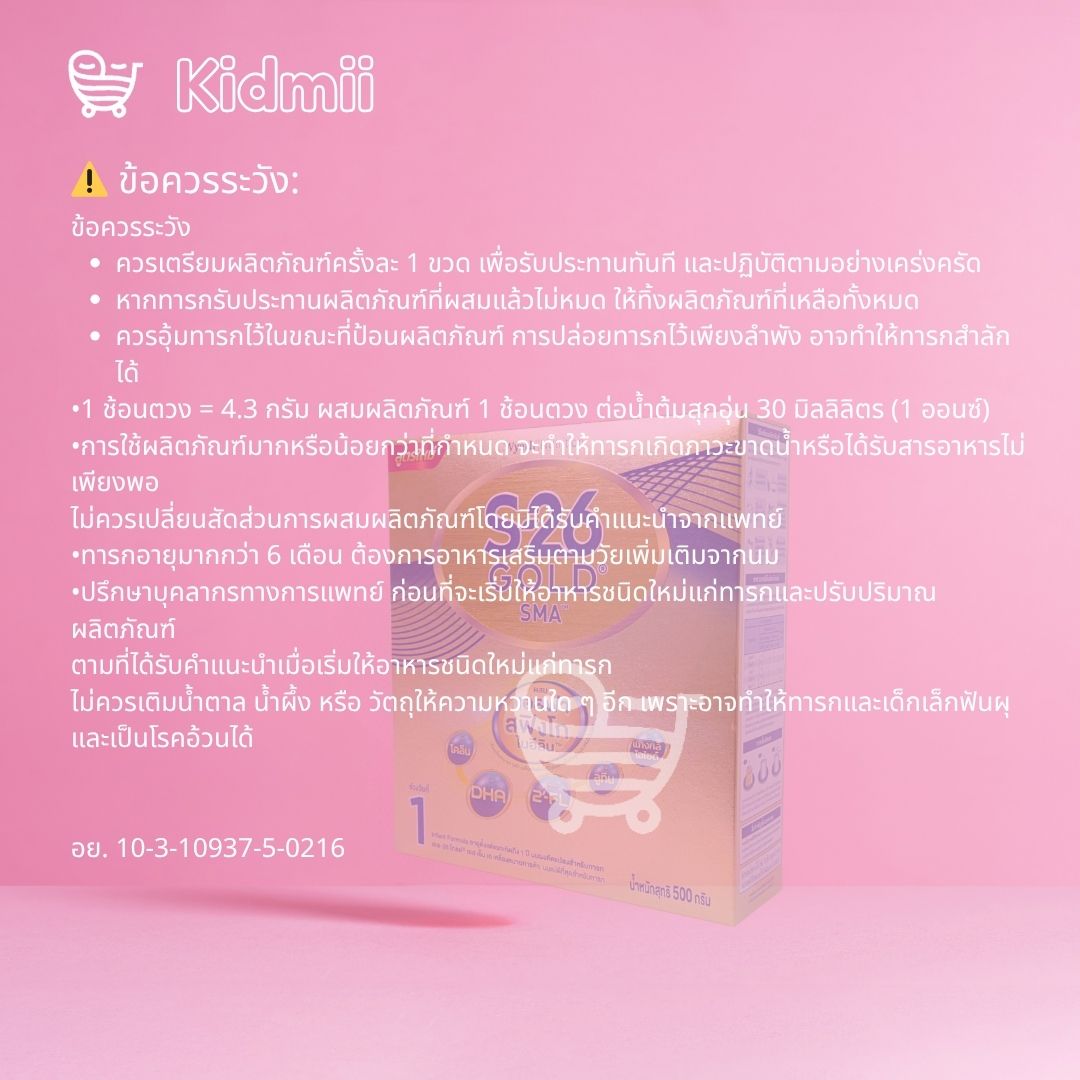 คำเตือน : การผสมน้ำที่ไม่ได้ต้มสุก ใช้ขวดนมหรือถ้วยที่ไม่ได้ผ่านการต้ม หรือผสมในอัตราส่วนที่ไม่ถูกต้อง มีผลทำให้ทารกเกิดการเจ็บป่วยได้ การเตรียมและการเก็บรักษาไม่ถูกวิธี อาจส่งผลต่อสุขภาพของบุตรท่าน