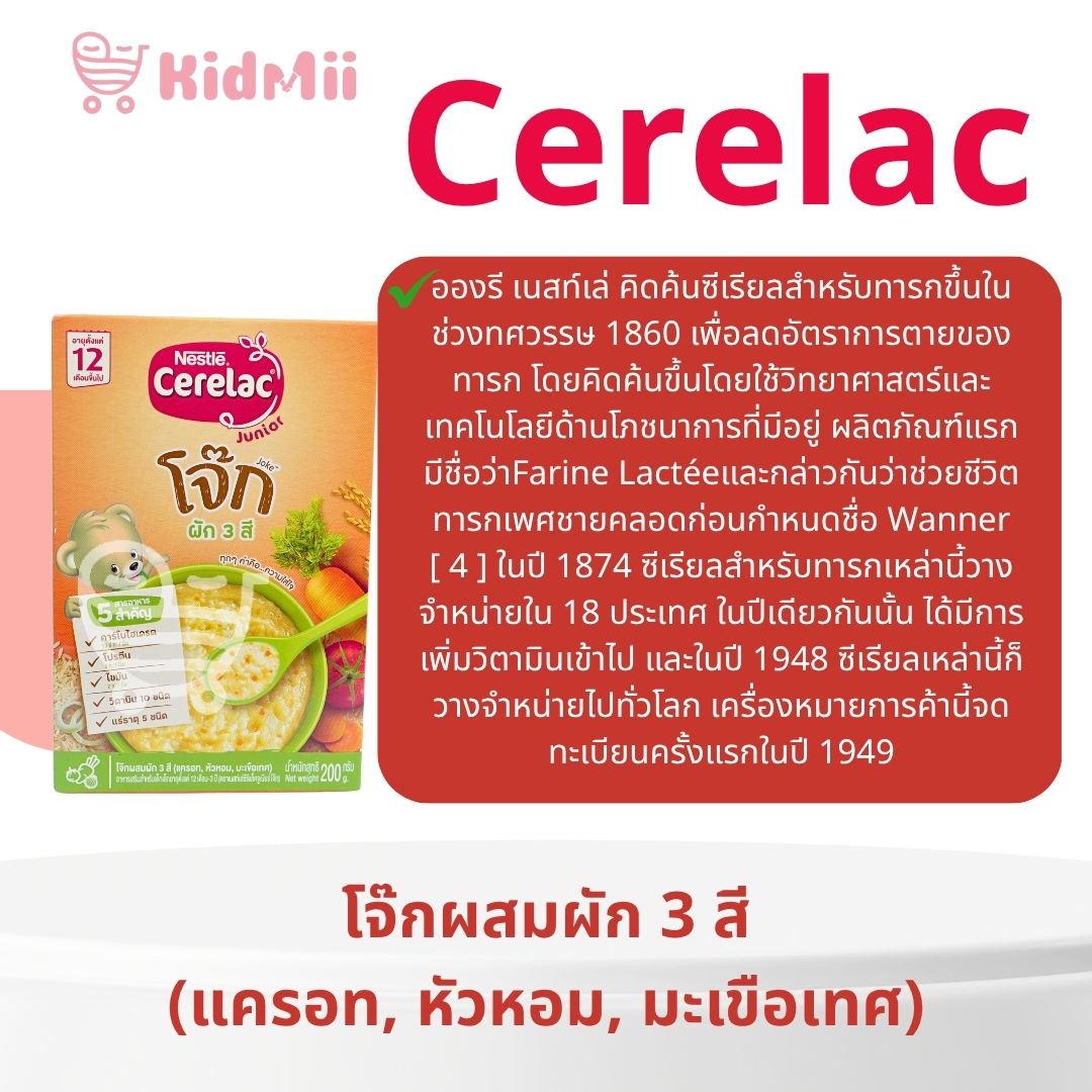 อองรี เนสท์เล่ คิดค้นซีเรียลสำหรับทารกขึ้นในช่วงทศวรรษ 1860 เพื่อลดอัตราการตายของทารก โดยคิดค้นขึ้นโดยใช้วิทยาศาสตร์และเทคโนโลยีด้านโภชนาการที่มีอยู่ ผลิตภัณฑ์แรกมีชื่อว่าFarine Lactéeและกล่าวกันว่าช่วยชีวิตทารกเพศชายคลอดก่อนกำหนดชื่อ Wanner [ 4 ] ในปี 1874 ซีเรียลสำหรับทารกเหล่านี้วางจำหน่ายใน 18 ประเทศ ในปีเดียวกันนั้น ได้มีการเพิ่มวิตามินเข้าไป และในปี 1948 ซีเรียลเหล่านี้ก็วางจำหน่ายไปทั่วโลก เครื่องหมายการค้านี้จดทะเบียนครั้งแรกในปี 1949ดทะเบียนครั้งแรกในปี 1949