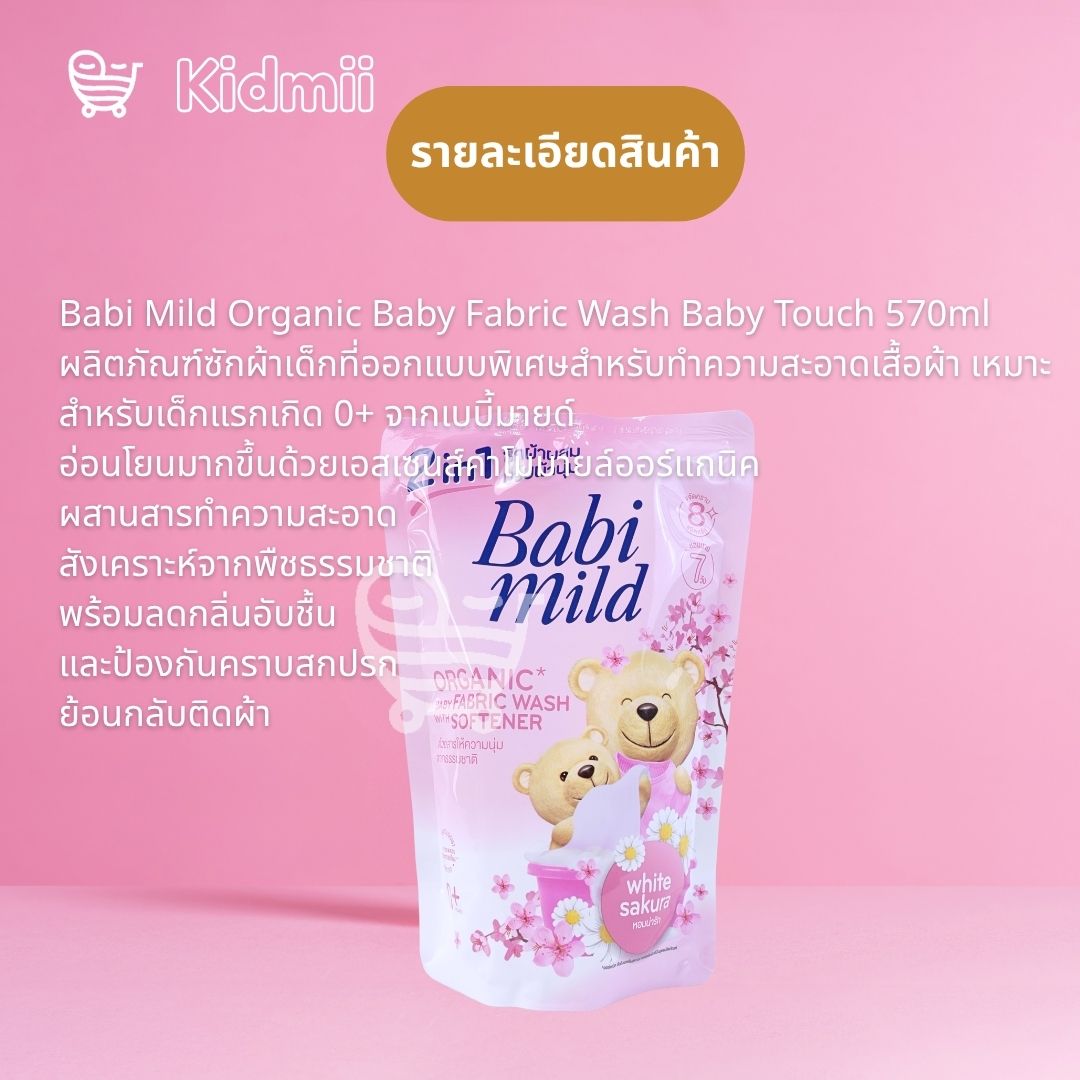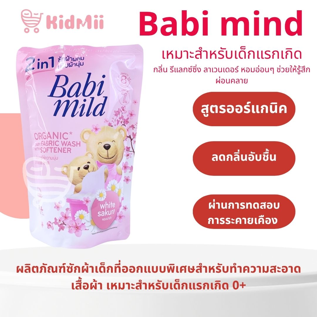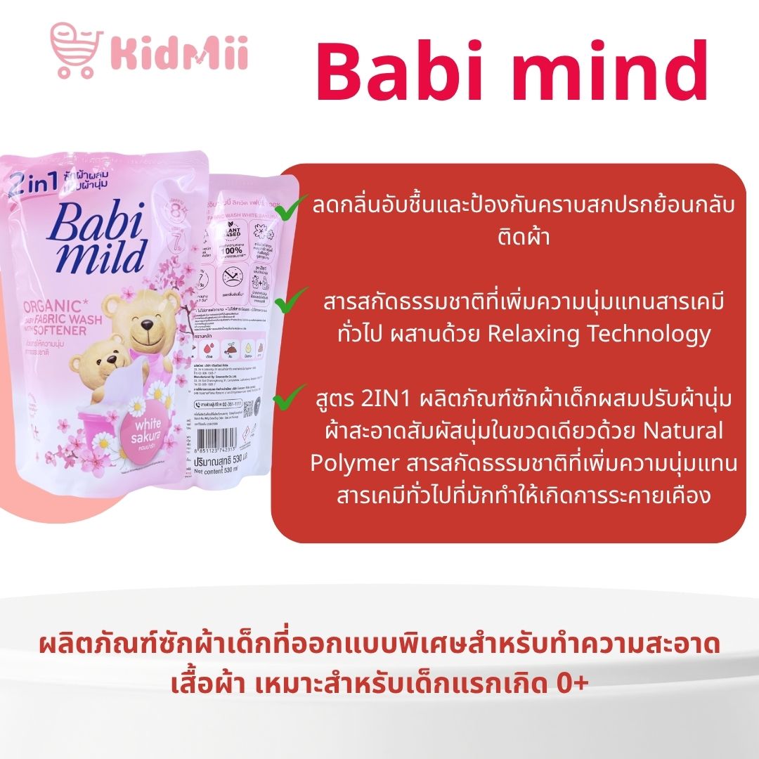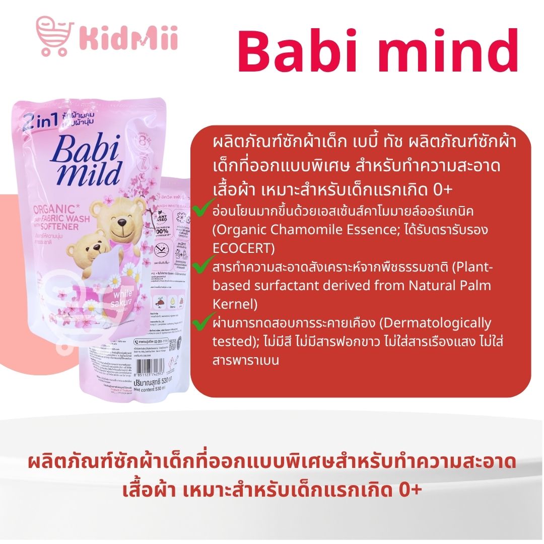 ผลิตภัณฑ์ซักผ้าเด็ก Babi Mild ที่ออกแบบพิเศษสำหรับทำความสะอาดและปรับผ้านุ่มในเวลาเดียวกัน เหมาะสำหรับเด็กแรกเกิด (0+) อ่อนโยนมากขึ้นเอสเซ้นส์ออร์แกนิคคาโมมายล์ สารทำความสะอาดสังเคราะห์จากพืชธรรมชาติ (Natural Palm Kernel); ผ้าสะอาดสัมผัสนุ่มในขวดเดียวด้วย Natural Polymer สารสกัดธรรมชาติที่เพิ่มความนุ่มแทนสารเคมีทั่วไป ผ่านการทดสอบการระคายเคือง (Dermatologically tested); ไม่มีสี ไม่มีสารฟอกขาว ไม่ใส่สารเรืองแสง ไม่ใส่สารพาราเบน ลดกลิ่นอับชื้นและป้องกันคราบสกปรกย้อนกลับติดผ้า