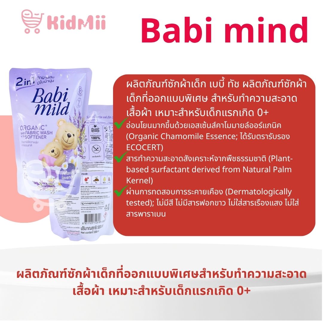 Babi mild เบบี้ มายด์ ผลิตภัณฑ์ซักผ้าเด็กผสมปรับผ้านุ่ม 2อิน1 กลิ่น รีแลกซ์ซิ่ง ลาเวนเดอร์ ขนาด 530 มล.