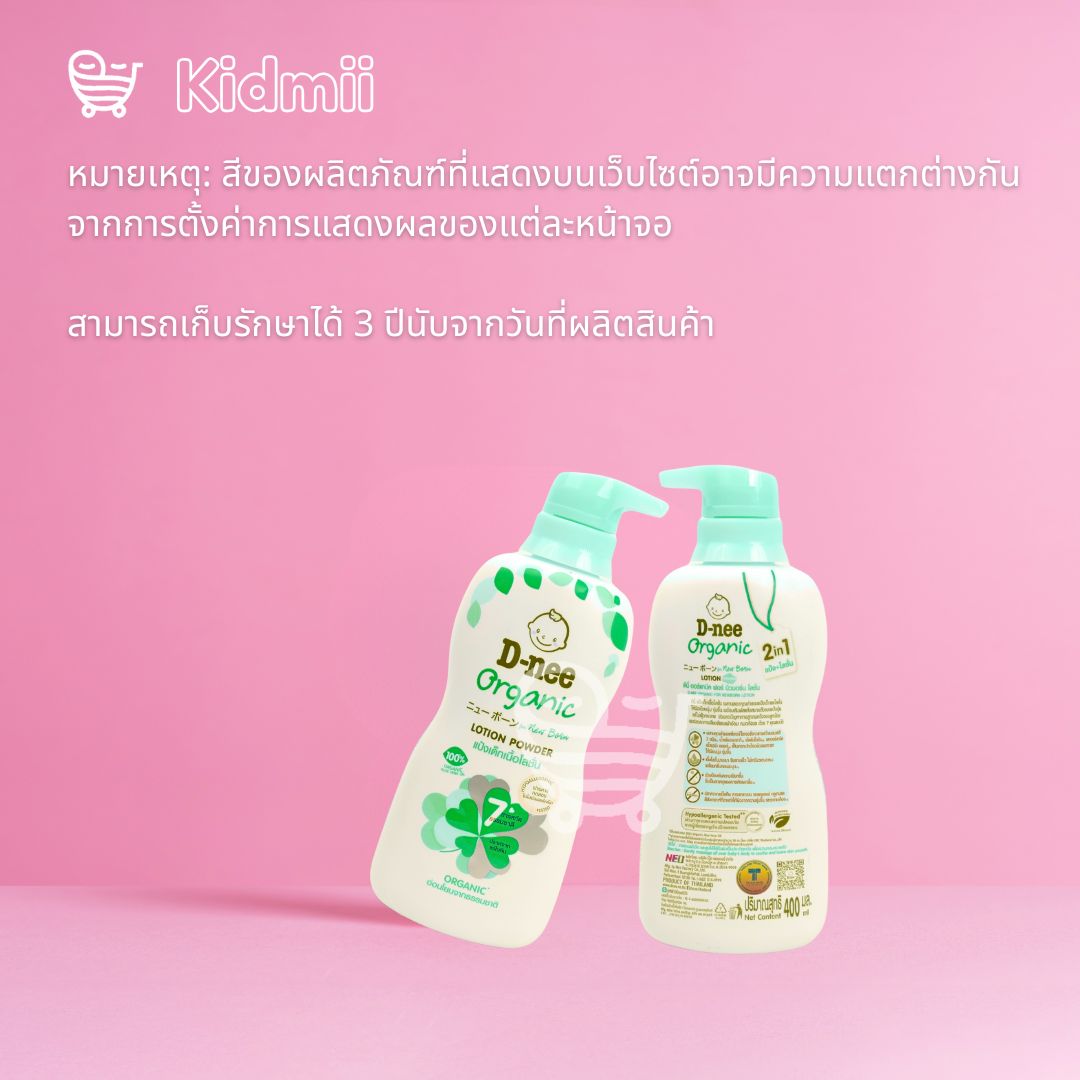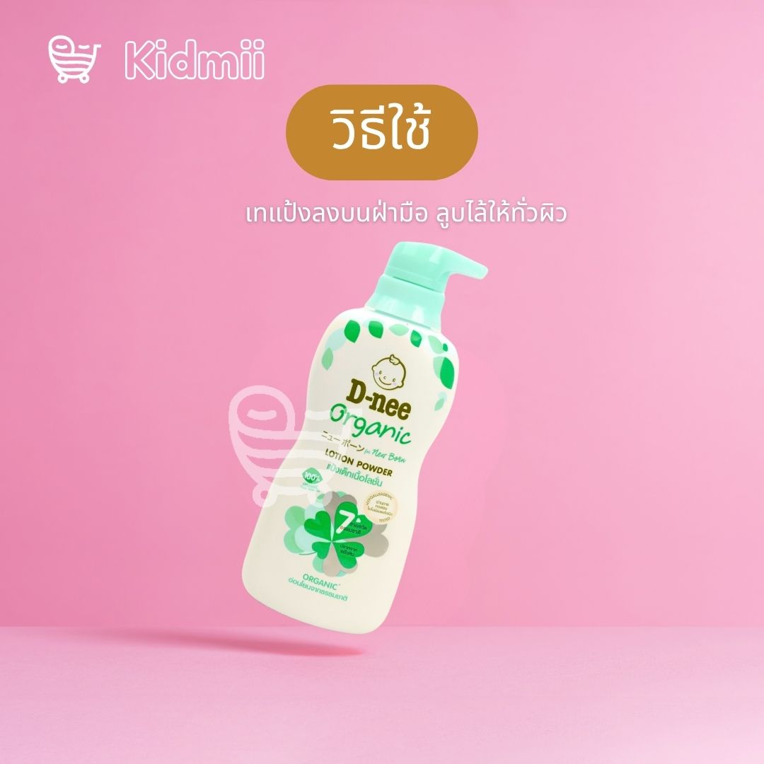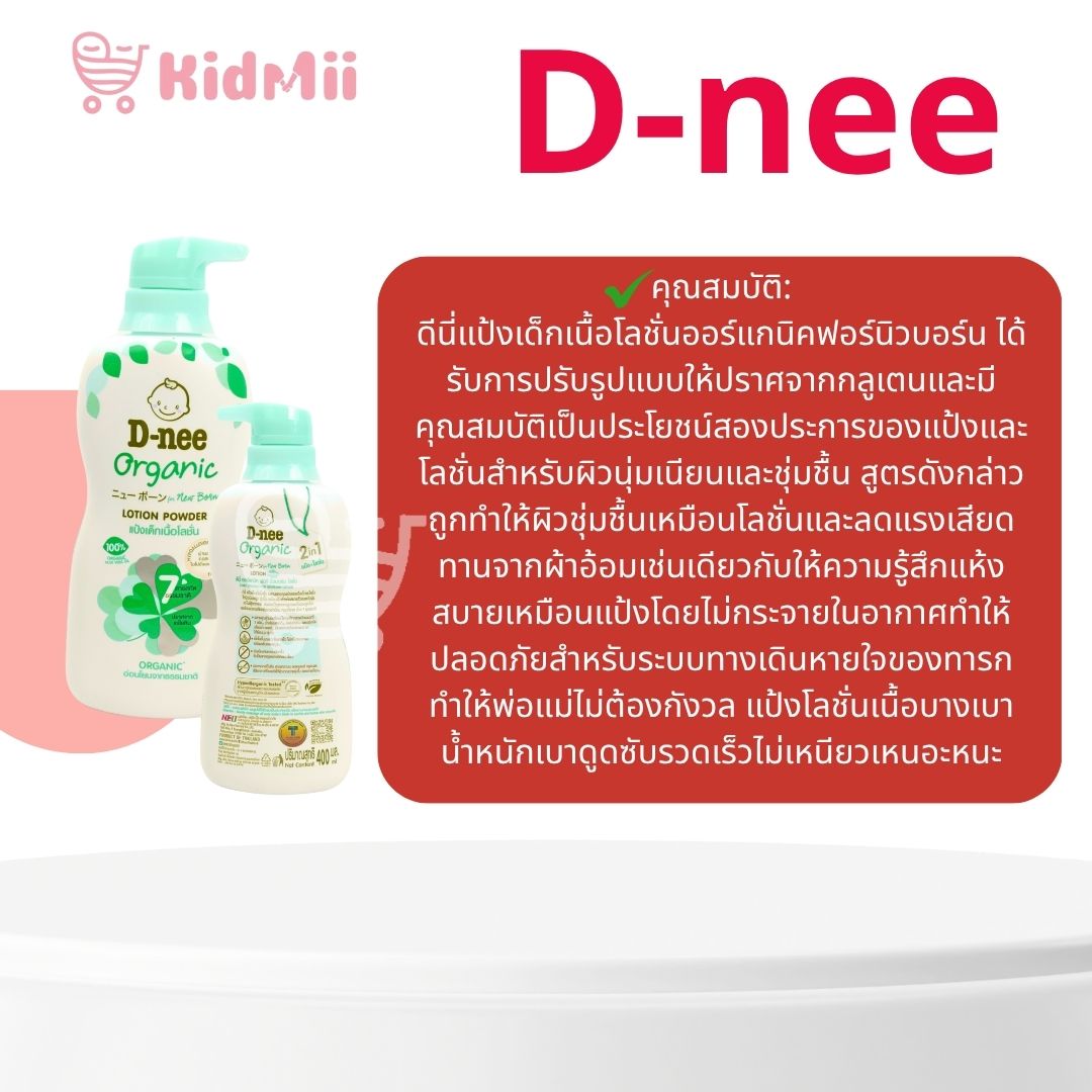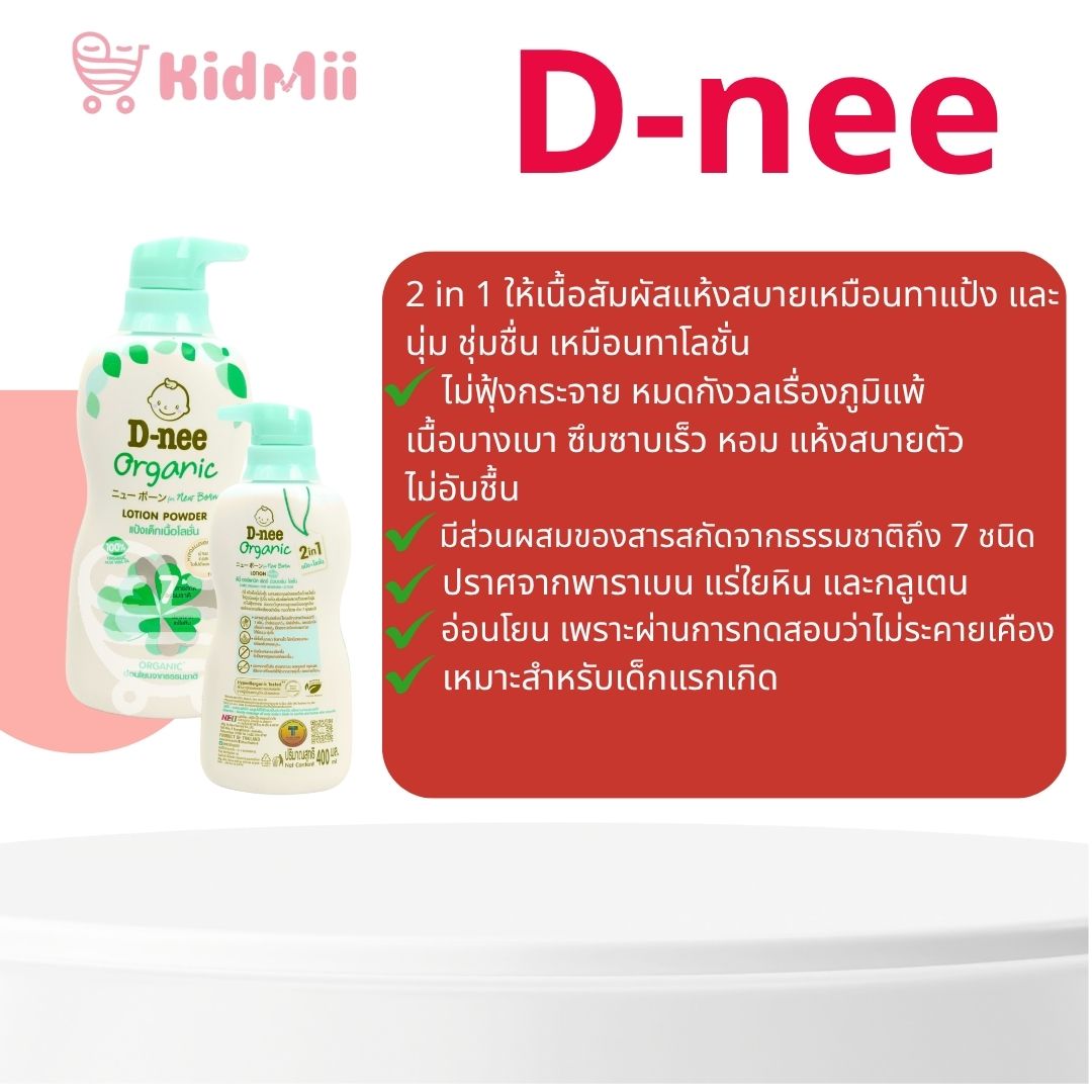 ดีนี่แป้งเด็กเนื้อโลชั่นออร์แกนิคฟอร์นิวบอร์น ได้รับการปรับรูปแบบให้ปราศจากกลูเตนและมีคุณสมบัติเป็นประโยชน์สองประการของแป้งและโลชั่นสำหรับผิวนุ่มเนียนและชุ่มชื้น สูตรดังกล่าวถูกทำให้ผิวชุ่มชื้นเหมือนโลชั่นและลดแรงเสียดทานจากผ้าอ้อมเช่นเดียวกับให้ความรู้สึกแห้งสบายเหมือนแป้งโดยไม่กระจายในอากาศทำให้ปลอดภัยสำหรับระบบทางเดินหายใจของทารกทำให้พ่อแม่ไม่ต้องกังวล แป้งโลชั่นเนื้อบางเบาน้ำหนักเบาดูดซับรวดเร็วไม่เหนียวเหนอะหนะ