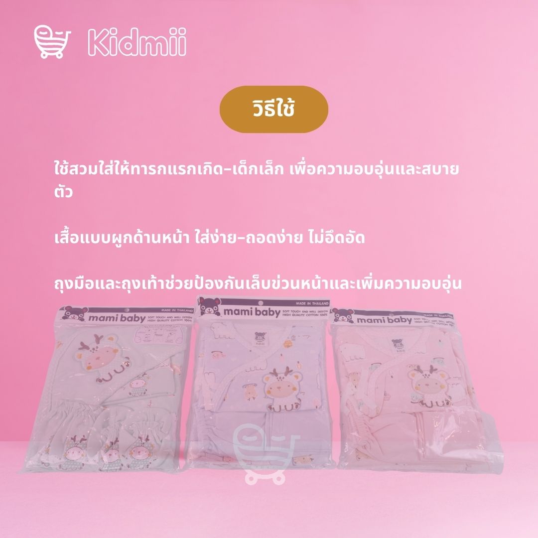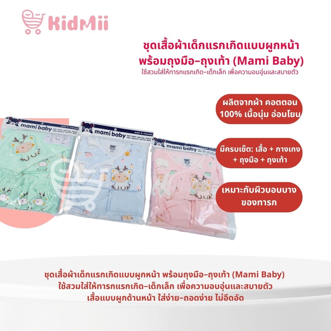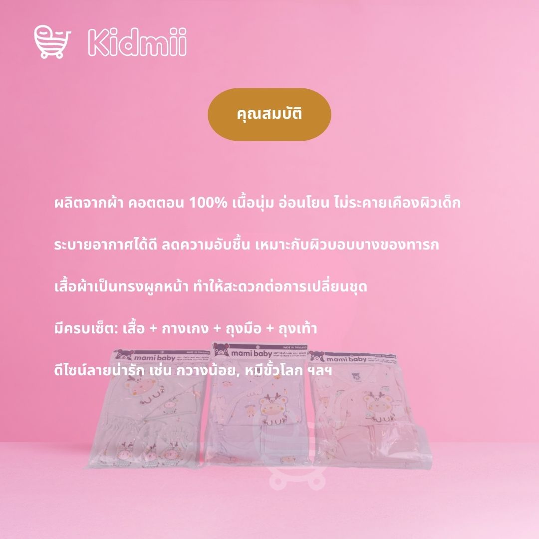 ชุดเสื้อผ้าเด็กแรกเกิดแบบผูกหน้า พร้อมถุงมือ–ถุงเท้า (Mami Baby)