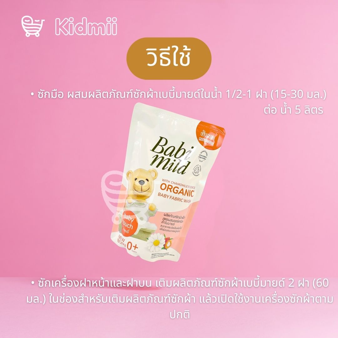 วิธีใช้ : ซักมือ - ผสมผลิตภัณฑ์ซักผ้าเบบี้มายด์ในน้ำ 1/2-1 ฝา (15-30 มล.) ต่อน้ำ 5 ลิตร