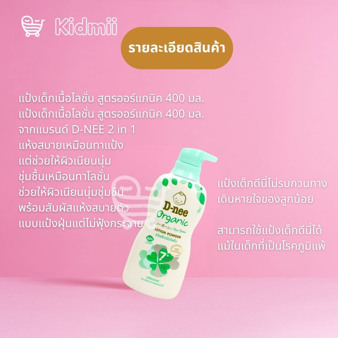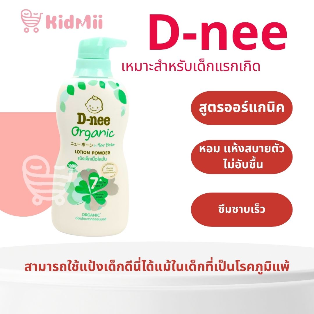 ดีนี่แป้งเด็กเนื้อโลชั่นออร์แกนิคฟอร์นิวบอร์น ได้รับการปรับรูปแบบให้ปราศจากกลูเตนและมีคุณสมบัติเป็นประโยชน์สองประการของแป้งและโลชั่นสำหรับผิวนุ่มเนียนและชุ่มชื้น สูตรดังกล่าวถูกทำให้ผิวชุ่มชื้นเหมือนโลชั่นและลดแรงเสียดทานจากผ้าอ้อมเช่นเดียวกับให้ความรู้สึกแห้งสบายเหมือนแป้งโดยไม่กระจายในอากาศทำให้ปลอดภัยสำหรับระบบทางเดินหายใจของทารกทำให้พ่อแม่ไม่ต้องกังวล แป้งโลชั่นเนื้อบางเบาน้ำหนักเบาดูดซับรวดเร็วไม่เหนียวเหนอะหนะ