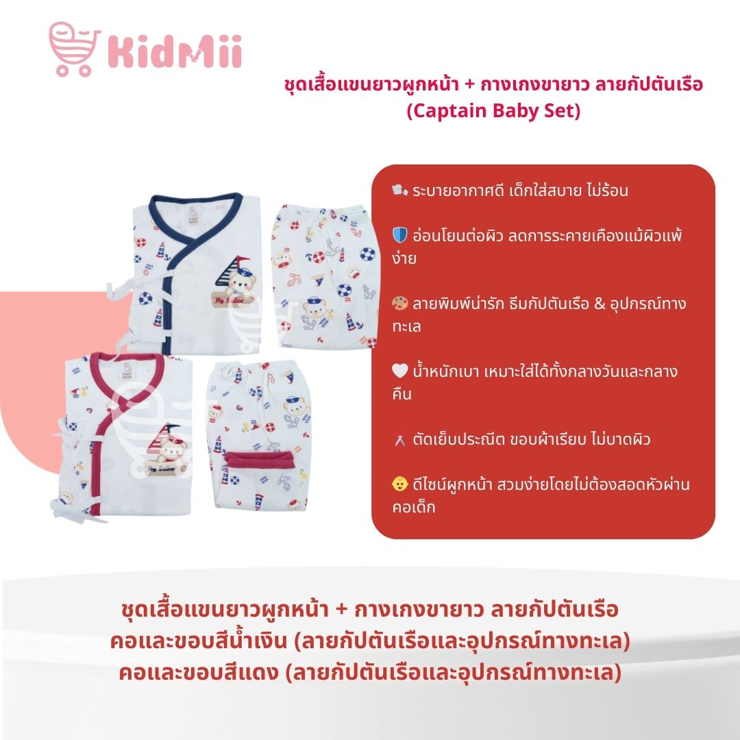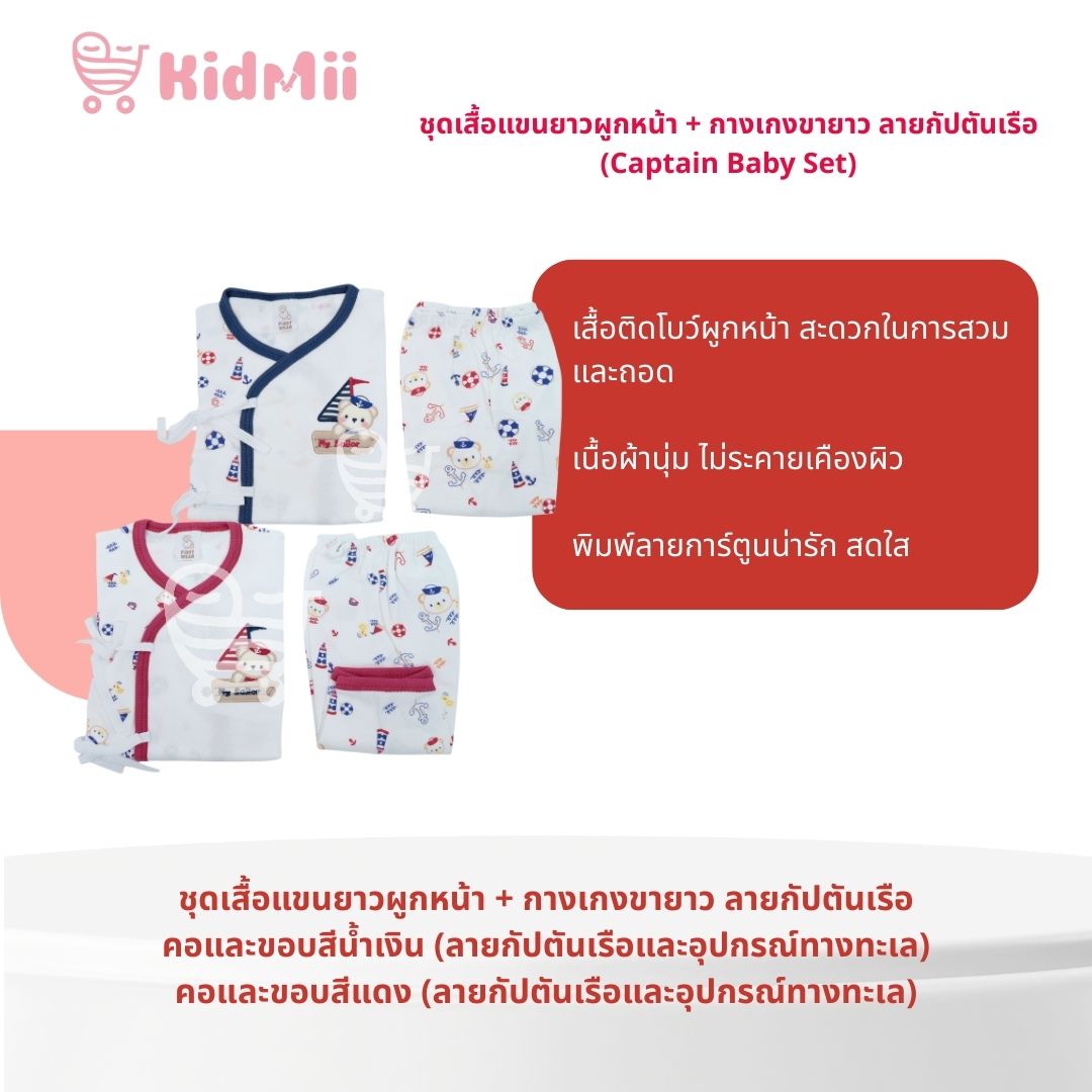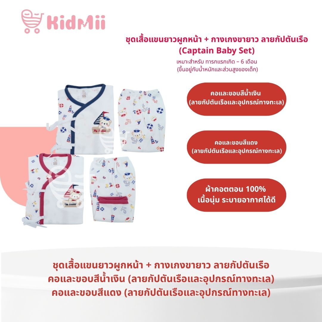- ชื่อสินค้า: ชุดเสื้อแขนยาวผูกหน้า + กางเกงขายาว ลายกัปตันเรือ (Captain Baby Set)